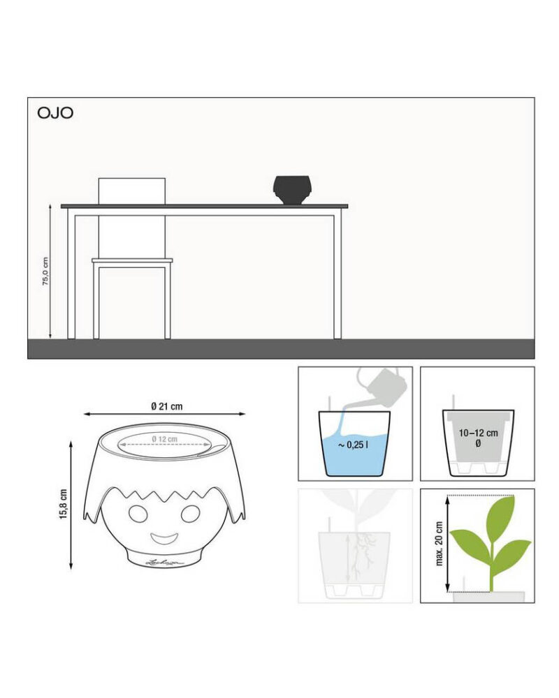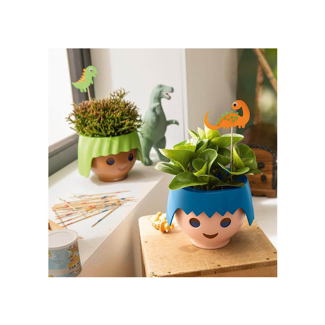 OJO, el original macetero de PLAYMOBIL y LECHUZA, está disponible con dos peinados y seis colores diferentes: rosa rubí, verde manzana, aguamarina, azul océano, rojo fuego y cuervo negro. El pack incluye maceta, ojos interactivos y sistema de riego a mecha