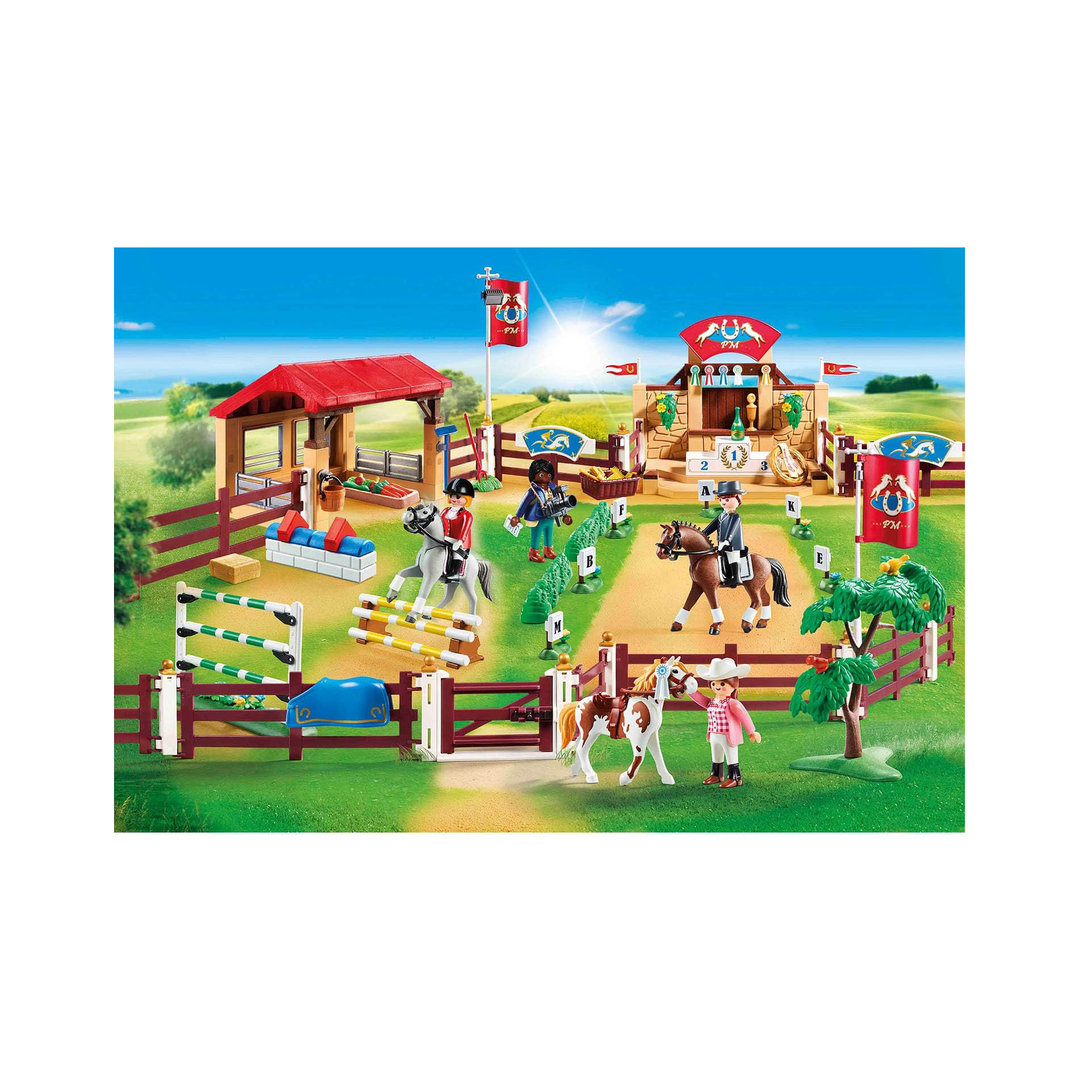 Playmobil 70337 Gran torneo ecuestre con cuatro figuras, tres caballos, establo, podio, obstáculos y muchos complementos.