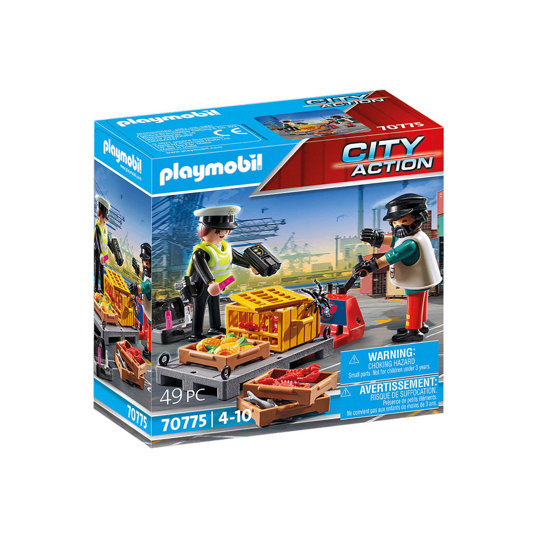 Playmobil 70775 Control aduanero. Con una agente de policia y un operario portuario con carretilla y palet con carga.