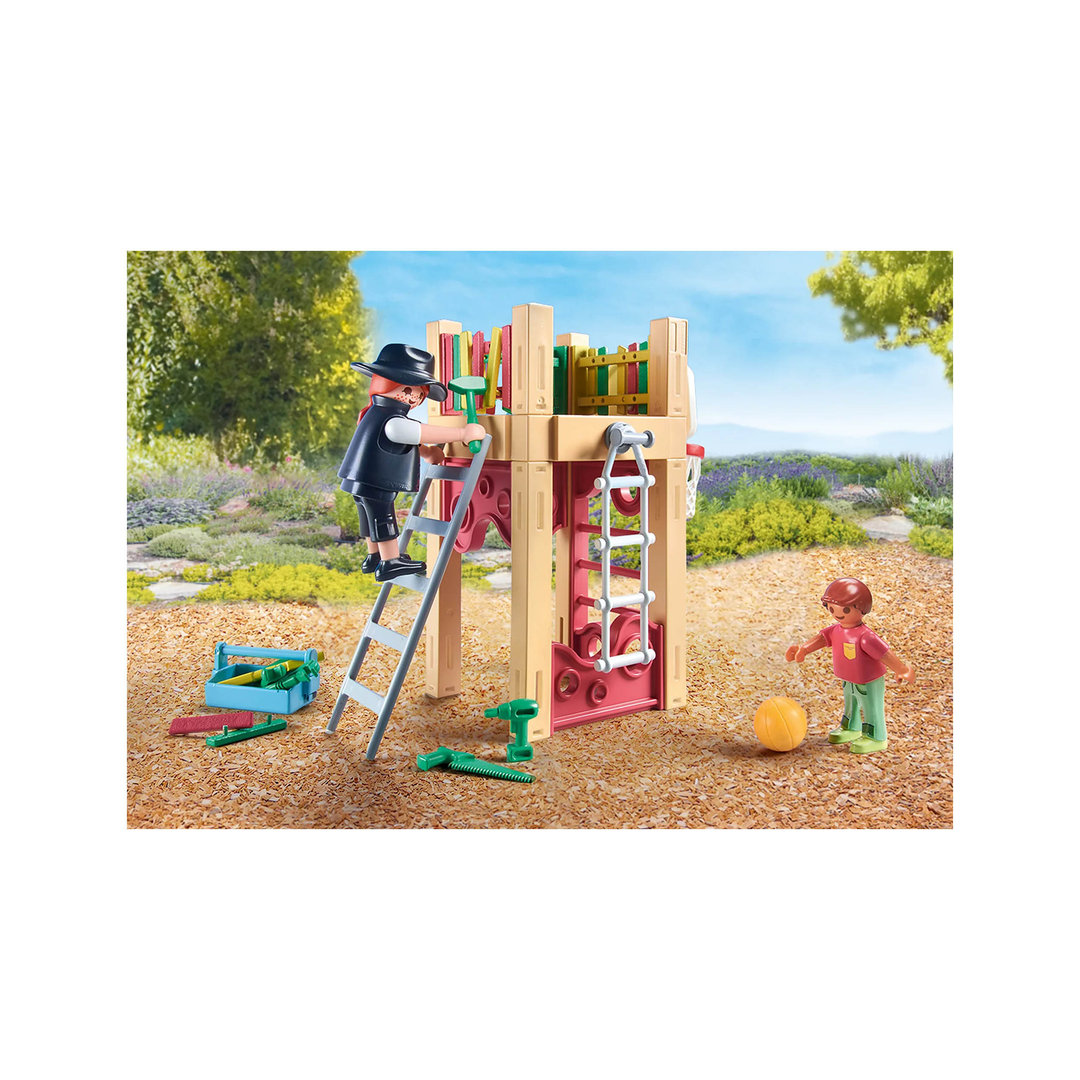 Playmobil 71475 Carpintera con torre de juegos y canasta de baloncesto para el pequeño niño con balón.