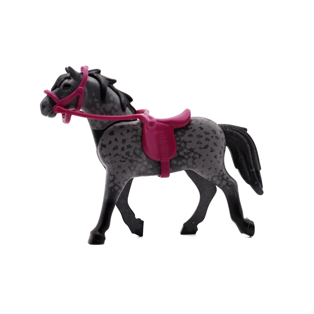 Playmobil Caballo gris oscuro moteado con silla de montar, cabezada y riendas. Listo para salir al trote o galope.