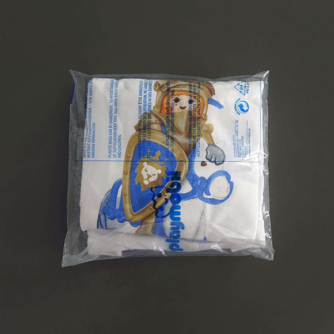 Playmobil camiseta Caballero Dorado para niño talla 135-150, XL. Camiseta con el estampado del caballero dorado, figura conmemorativa del 30 aniversario de Playmobil. La prenda ha sido estampada en camisetas de 100% algodón de la marca B&C y viene en bolsa de plástico de Playmobil.