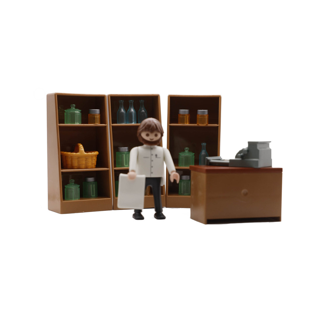Playmobil Farmaceutico boticario con estanterias, frascos, botes, botellas, caja registrado y mostrador.
